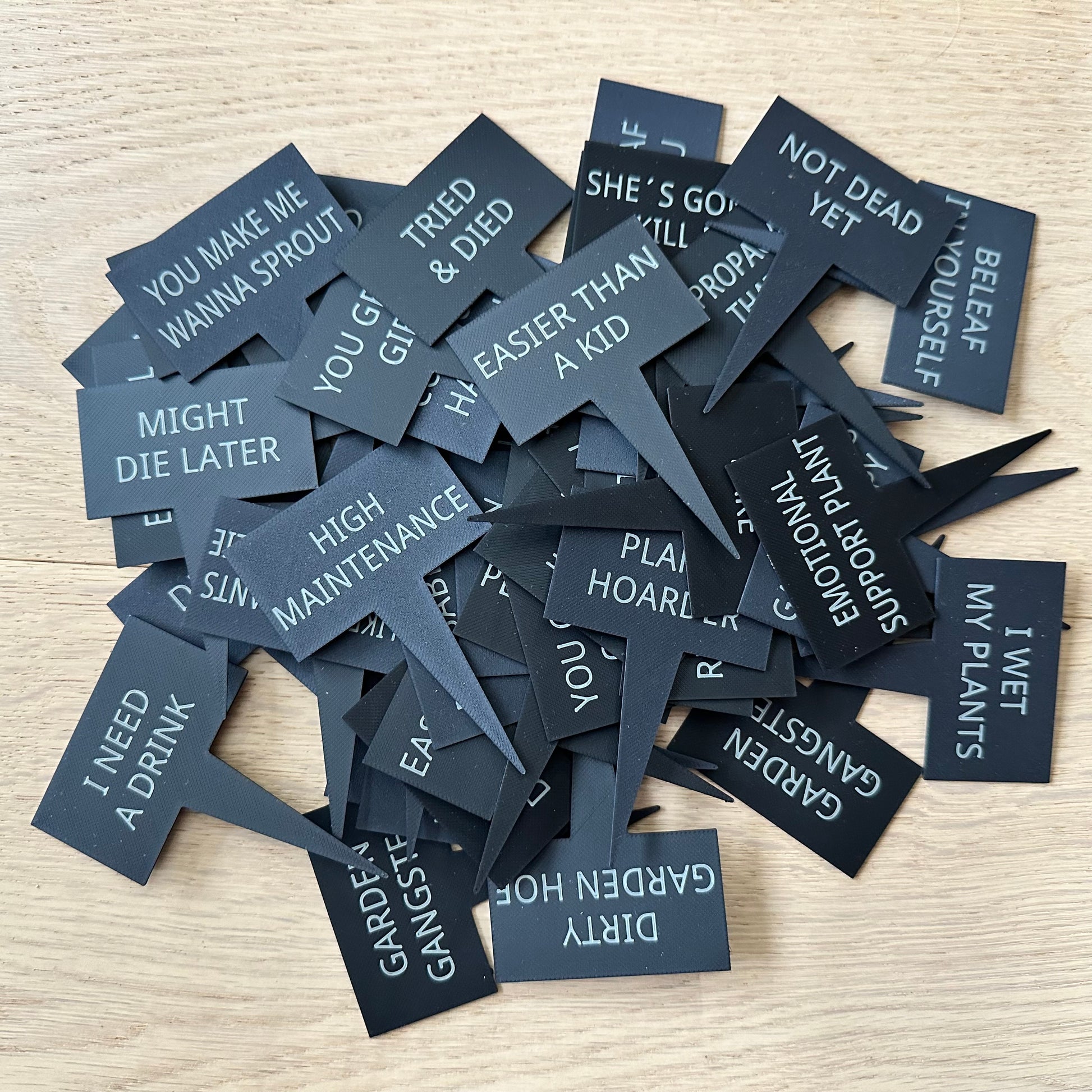 Velg de plantepinnene med teksten du liker best, selger minimum 10 stk av gangen.
